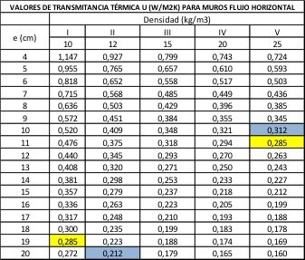 En el cuadro se muestran los diferentes valores de transmitancia térmica de muros realizados con el sistema Baupanel en las cinco densidades normalizadas de poliestireno expandido para espesores de núcleo termo aislante desde 4 hasta 30 cm.