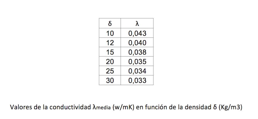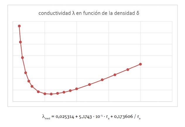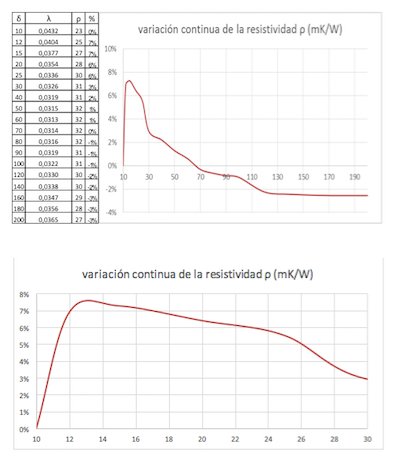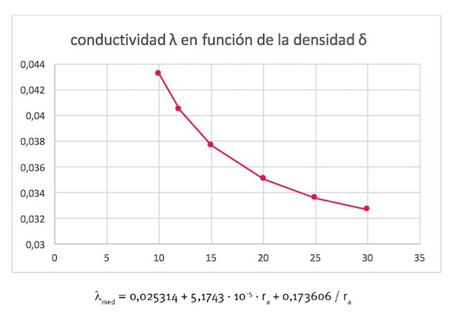 El resultado, para este tipo de productos es que se verifica un mínimo de conductividad, en una gráfica con dos ramas ascendentes, tanto en densidades bajas (por debajo de unos 25 kg/m3) como altas (por encima de unos 50 kg/m3).