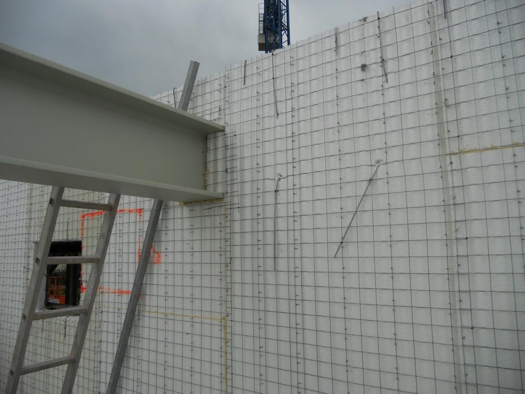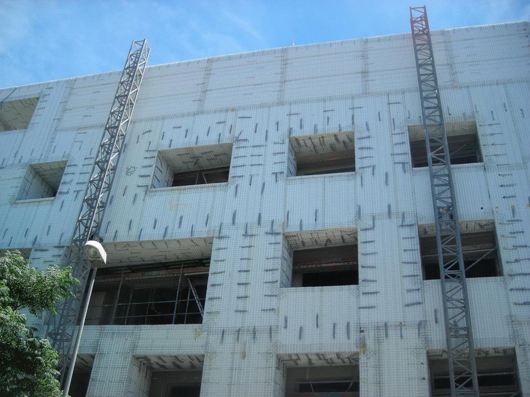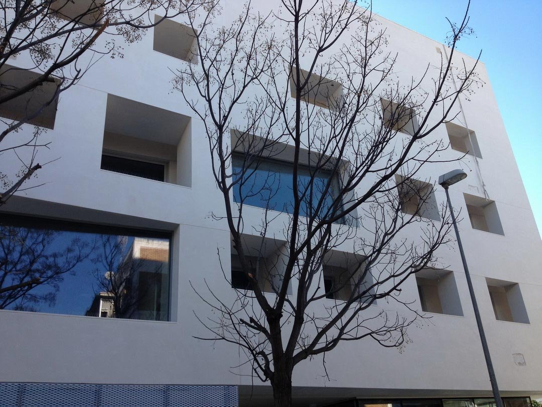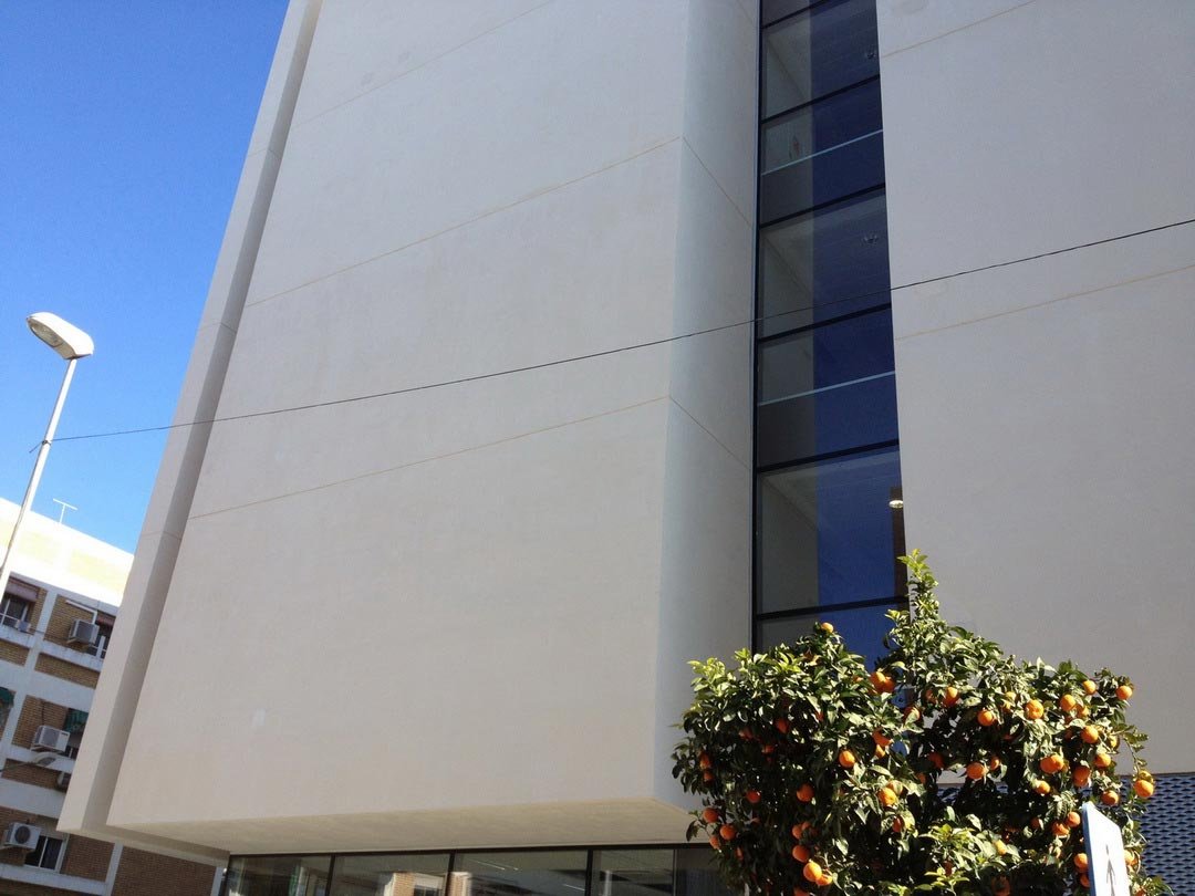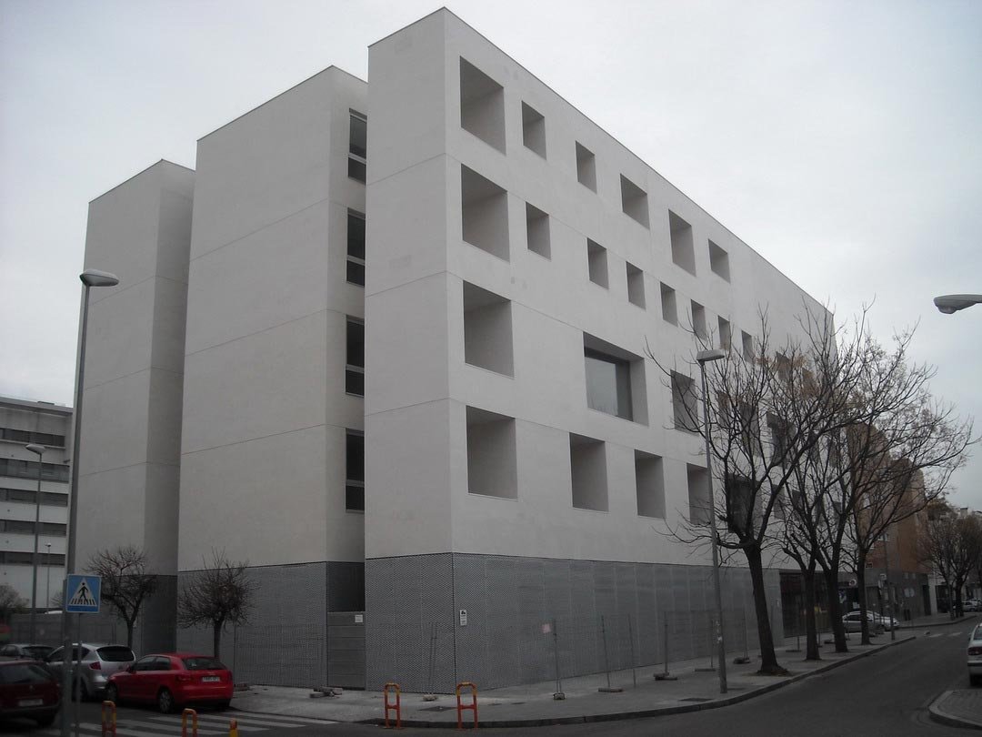 Facade enclosure 55 meters high in a building in the expansion of Vallecas, Madrid, carried out in 2011. Baupanel® system for facades and integral work.