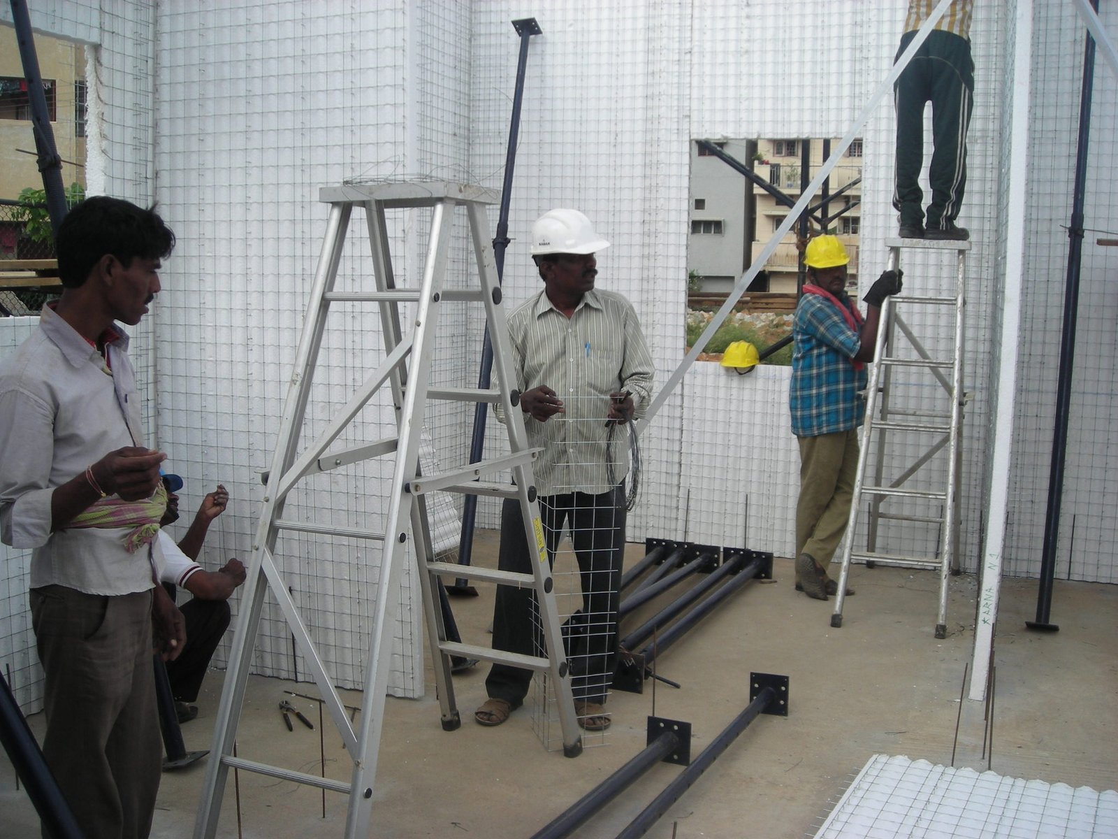 The panels are installed on site according to the layout of the walls, partitions and framework of the project and they are finished on site by applying micro-concrete through a mechanism known as pneumatic discharge (shortcrete).